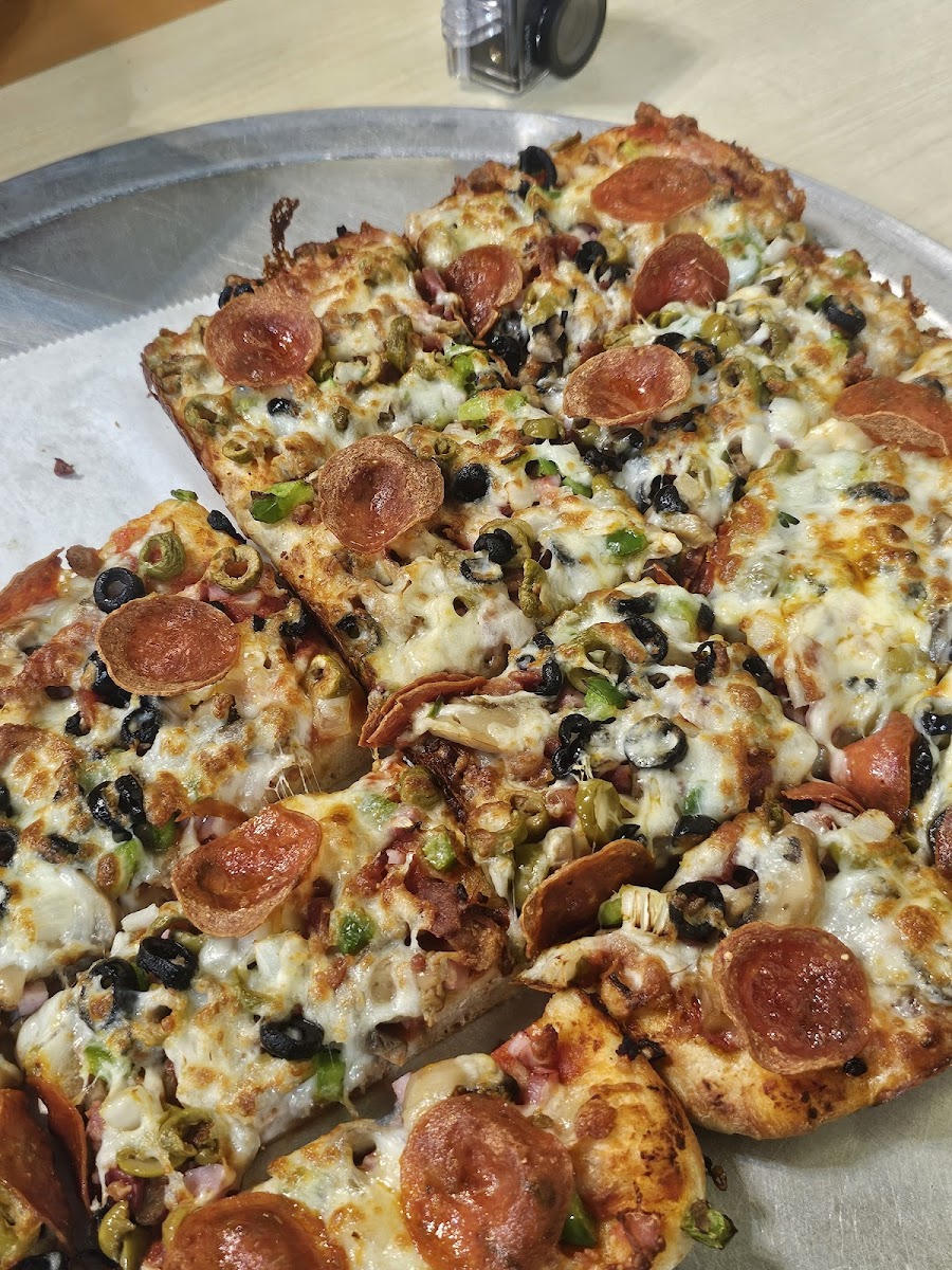 The jumbo pan pizza is huge. 3 pans worth. Figure it was like an 18" for the price. Was delicious! Everything pizza is a must. Garlic bread sticks are delicious too.